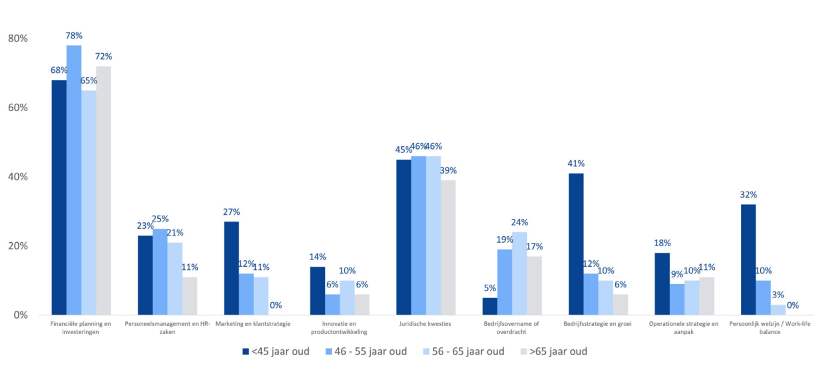‘Ondernemers zijn het meest geneigd om advies te zoeken rond financiële planning en investeringen en juridische kwesties. Opvallend is dat strategische vraagstukken, zoals bijvoorbeeld klantenstrategie, innovatie en de bedrijfsstrategie, minder vaak het onderwerp zijn van advies. Enkel ongeveer de helft van de ondernemers jonger dan 45 jaar oud (41%) zegt hier advies over te zoeken.