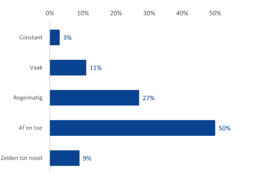 Een onderneming runnen is voor heel wat ondernemers een huzarenwerk. We zien dit ook duidelijk in dit resultaat. Maar liefst 91% van de bevraagde ondernemers geeft aan minstens af en toe geconfronteerd te worden met professionele uitdagingen of beslissingen waarmee ze het moeilijk hebben. Bijna de helft (42%) zelfs vaak of constant.