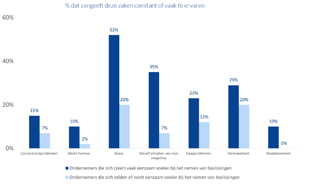 Vergelijken we ondernemers die zich (zeer) vaak eenzaam voelen bij het maken van professionele keuzes met ondernemers die zichzelf nooit eenzaam voelen, dan zien we een interessant verschil: ondernemers die zich niet eenzaam voelen hebben veel minder last van stress bij het nemen van beslissingen en zijn minder geneigd om zich af te sluiten van hun omgeving. Dit toont duidelijk aan dat het loont om zich te laten omringen.